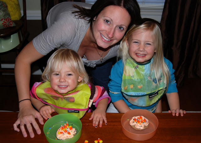 Twice a year we decorate cookies; at Halloween and at Christmas. Not sure why those 2 holidays make us feel like eating cookies with frosting and sprinkles, but that's just the life that we live. I made some whole wheat sugar cookies that were very good but not too sweet. Adding the sugary frosting and sprinkles makes them perfect. Orange frosting, sprinkles and candy corn = happy kids and delicious cookies.